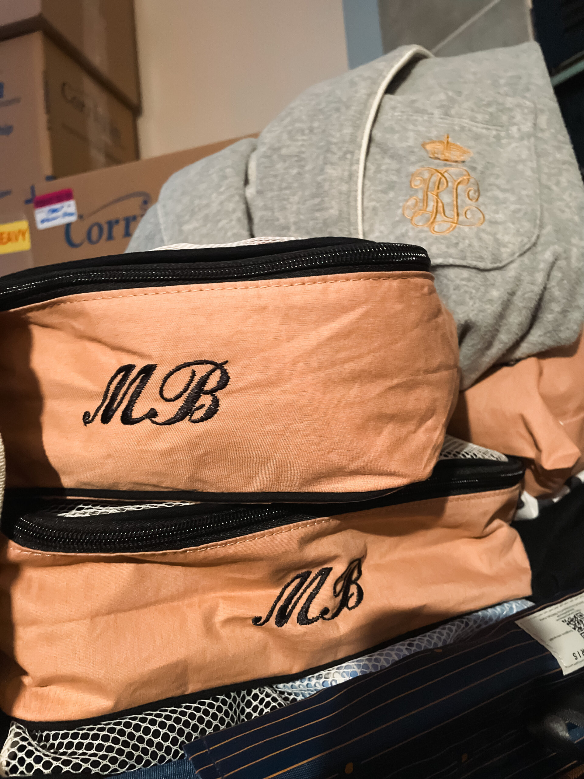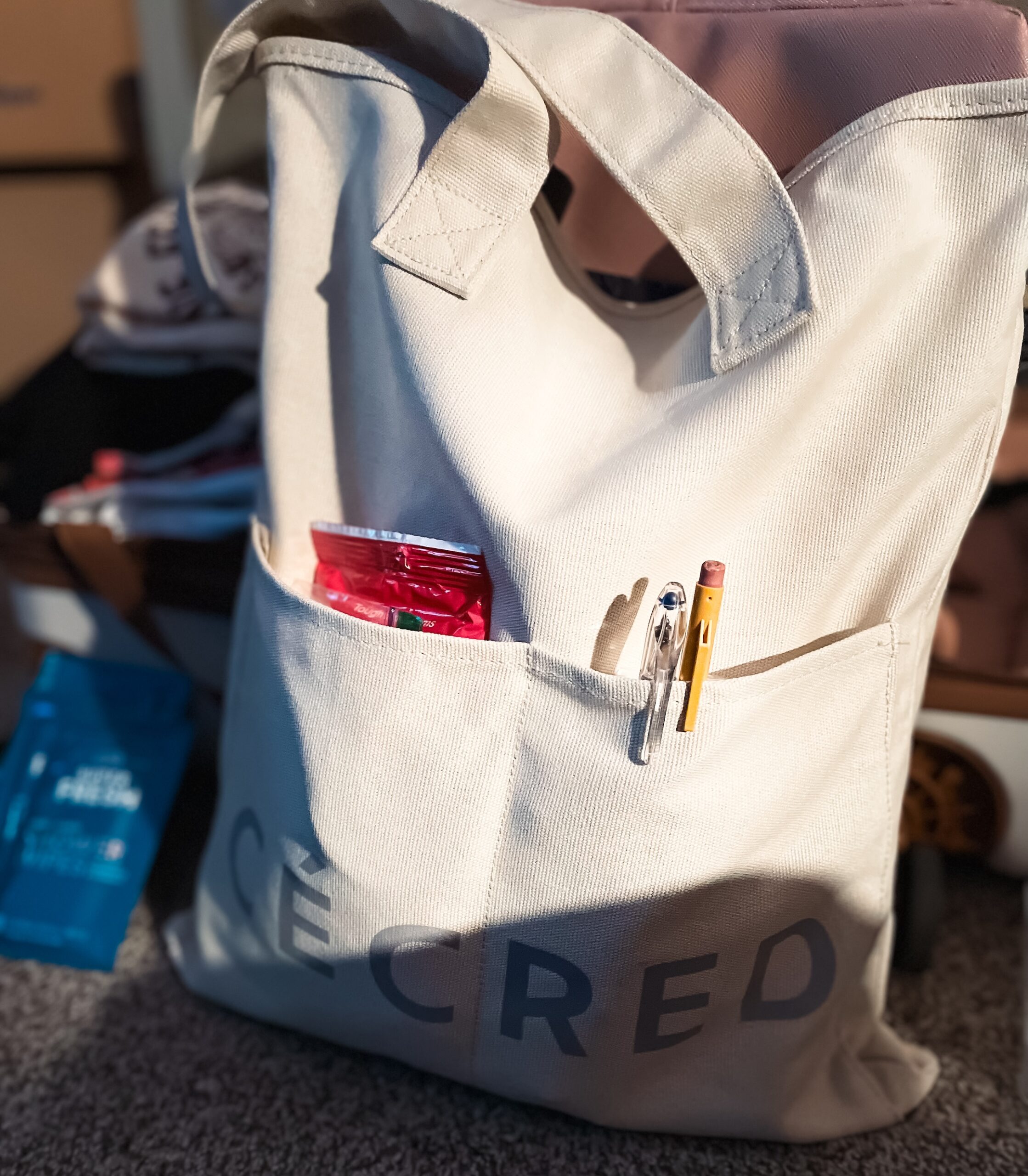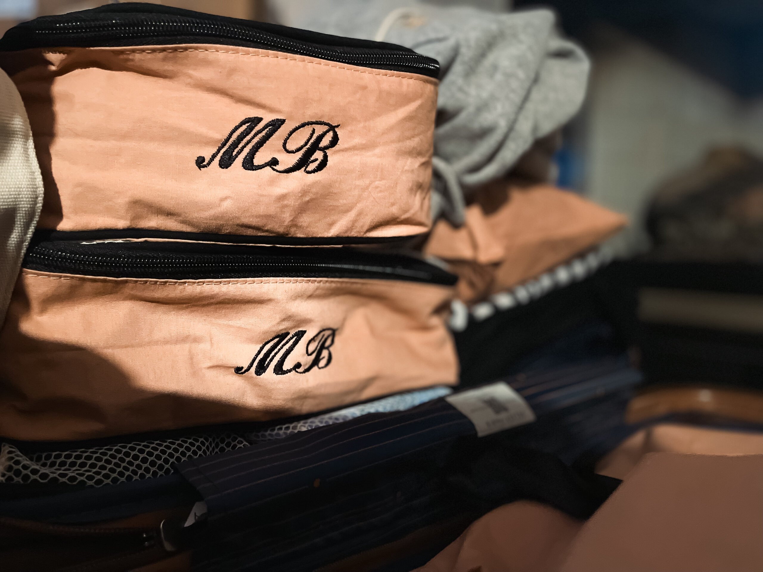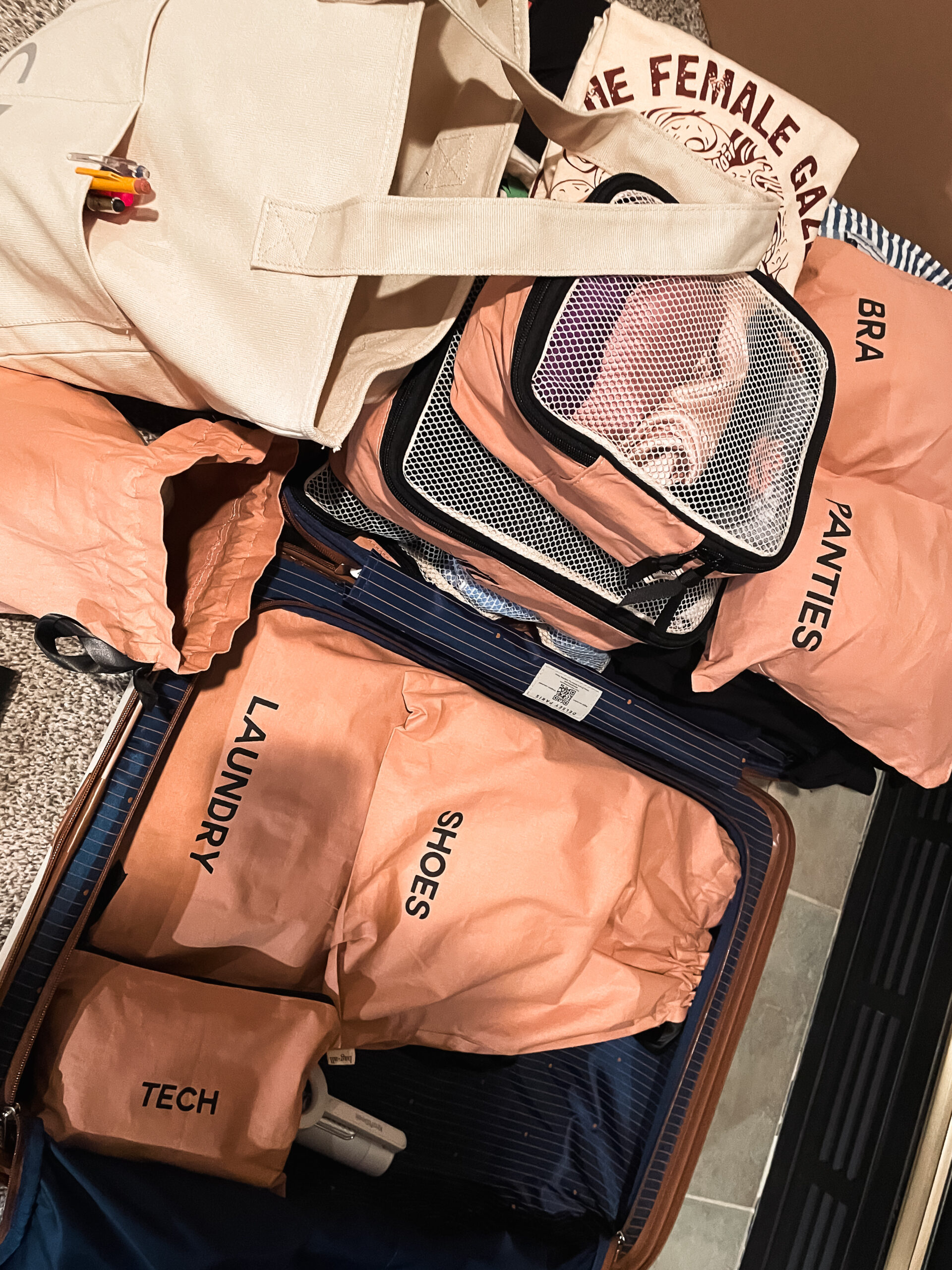 Open suitcase packed with blush pink labeled pouches, mesh packing cubes, and tote bags during a cross-country moveblank