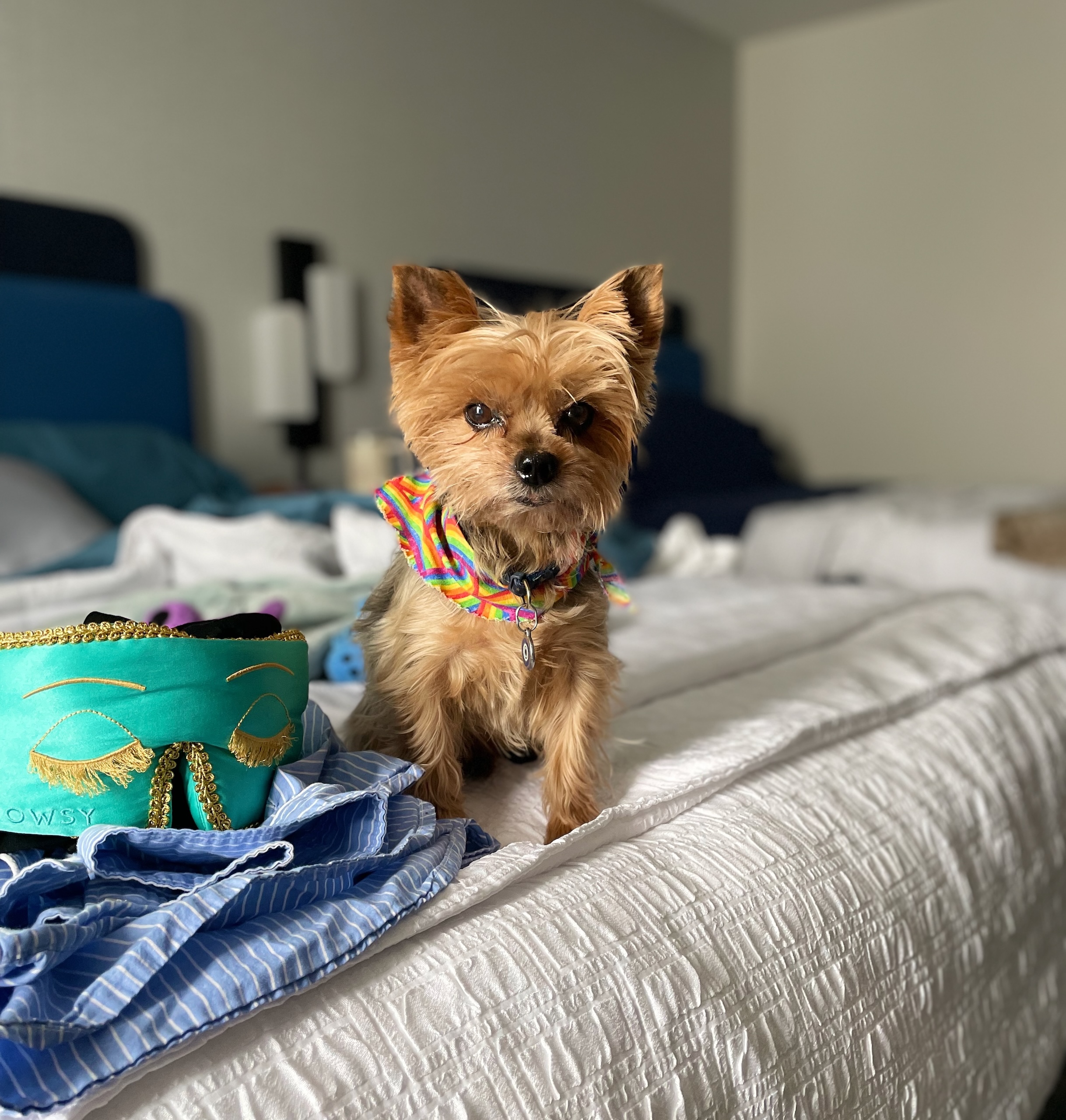Ted watched every movement closely — especially when a DoorDash bag appeared. Even in unfamiliar places, ordinary life continues. Hunger arrives. Rest is needed. A bed becomes a place to settle, if only for a night. The room was not home, but it held us while home was no longer available.